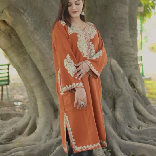 Stay cozy and stylish this winter with our Neck Design Zari Embroidered Rust Color Kashmiri Pheran. Made with love and care, this winter wear is perfect for those who want to stay warm without compromising on fashion. The intricate zari embroidery adds a touch of elegance to this beautiful piece Stay warm and stylish this winter with our Neck Design Zari Embroidered Rust Color Kashmiri Pheran. Made with love, it’s the perfect winter wear to keep you cozy and fashionable.