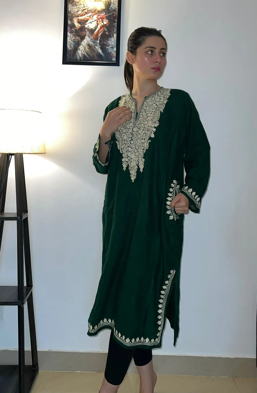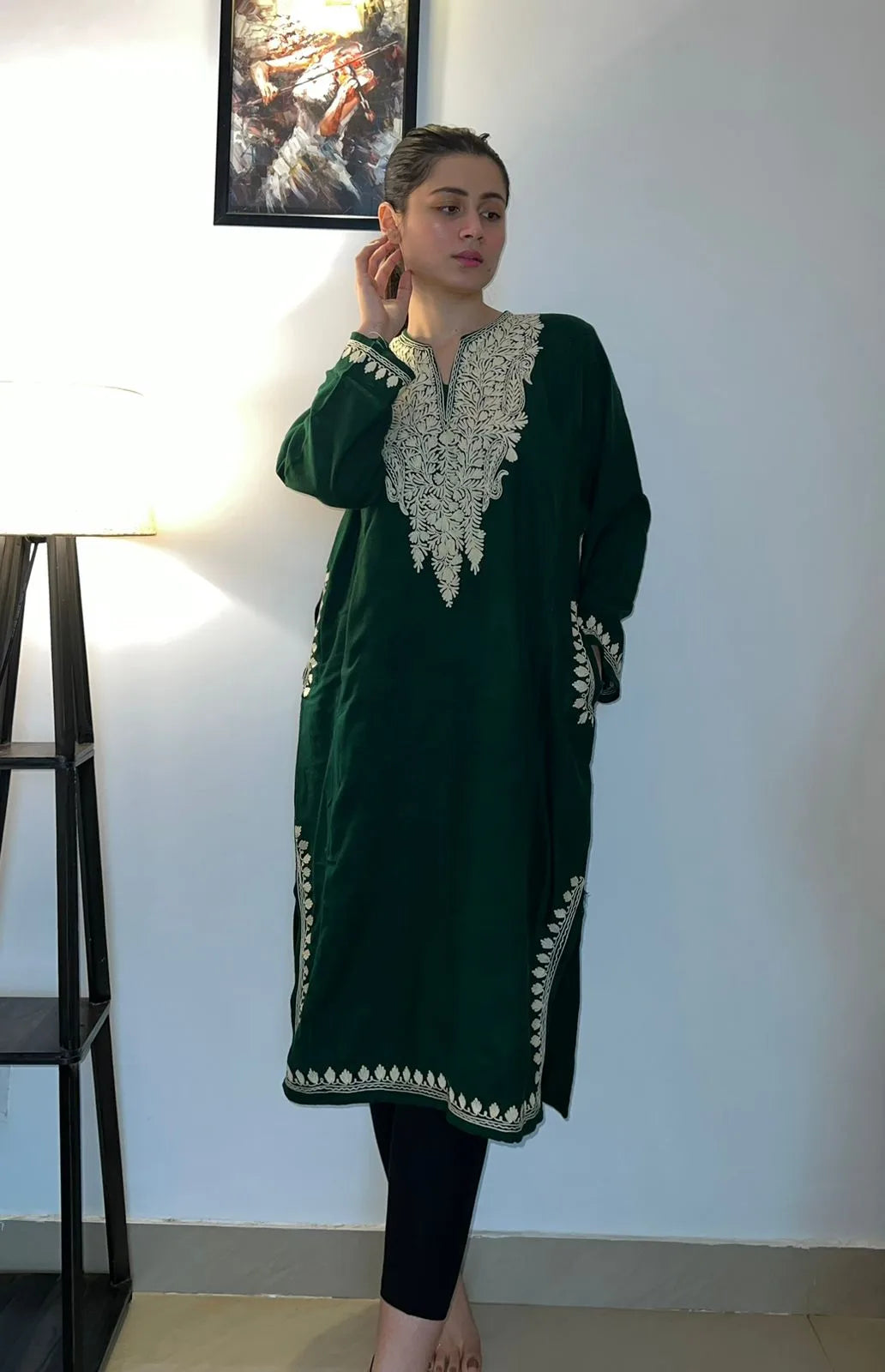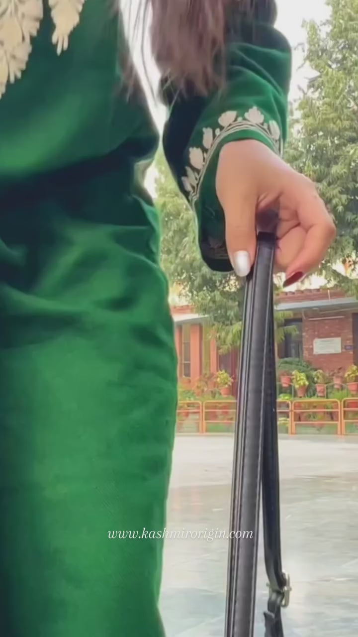 Free Shipping All over India Step into the world of elegance with our Pine Green Aari Embroidered Pheran. Handcrafted with love, this exquisite piece showcases intricate embroidery, adding a touch of tradition and charm to your wardrobe.