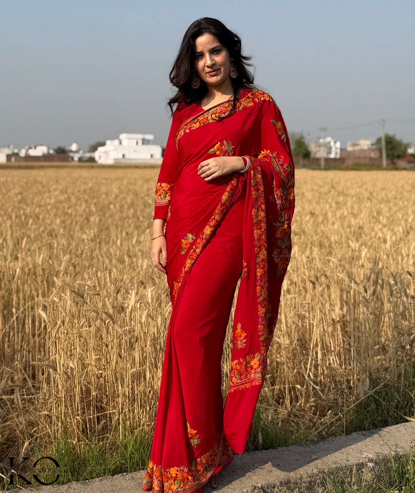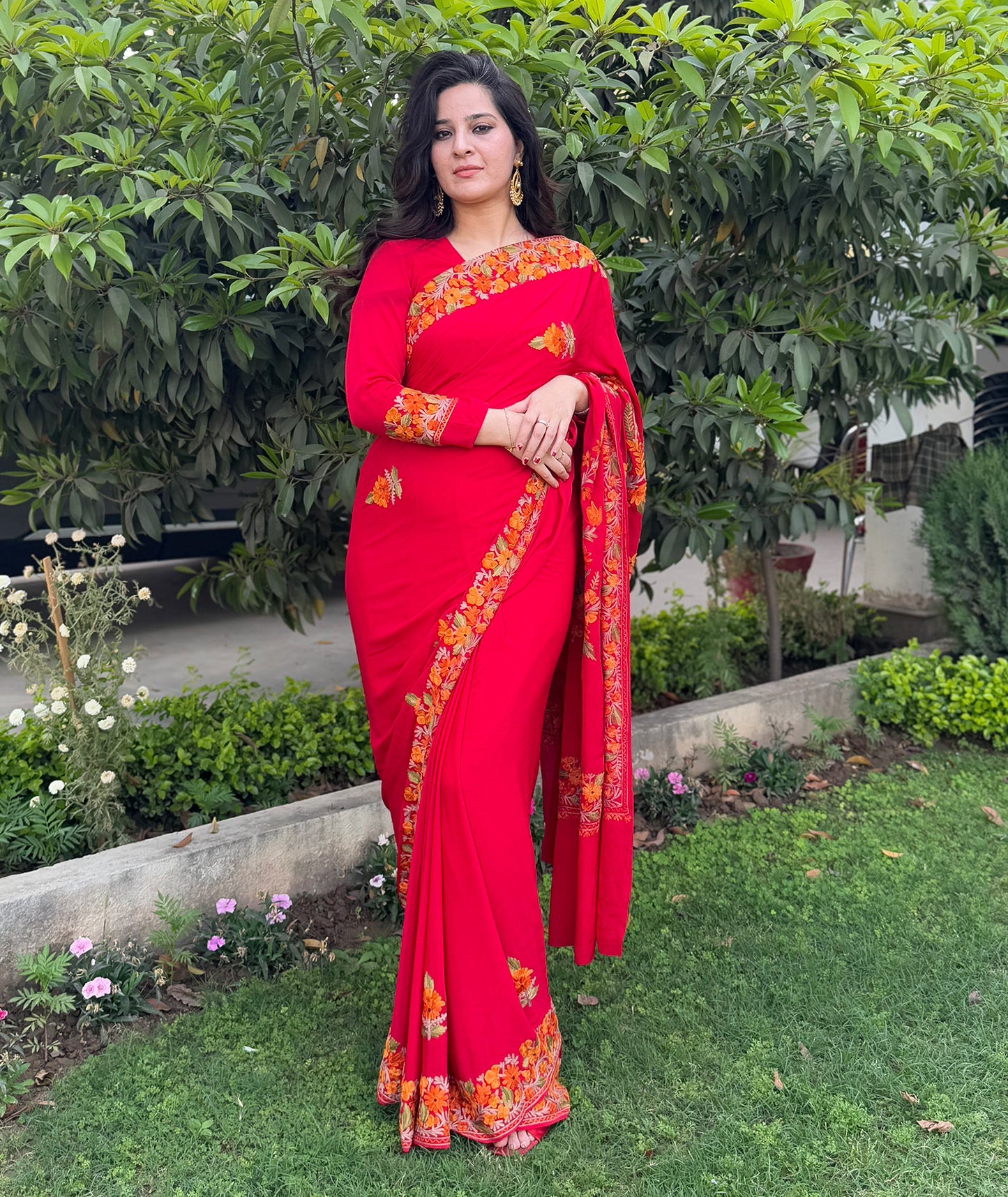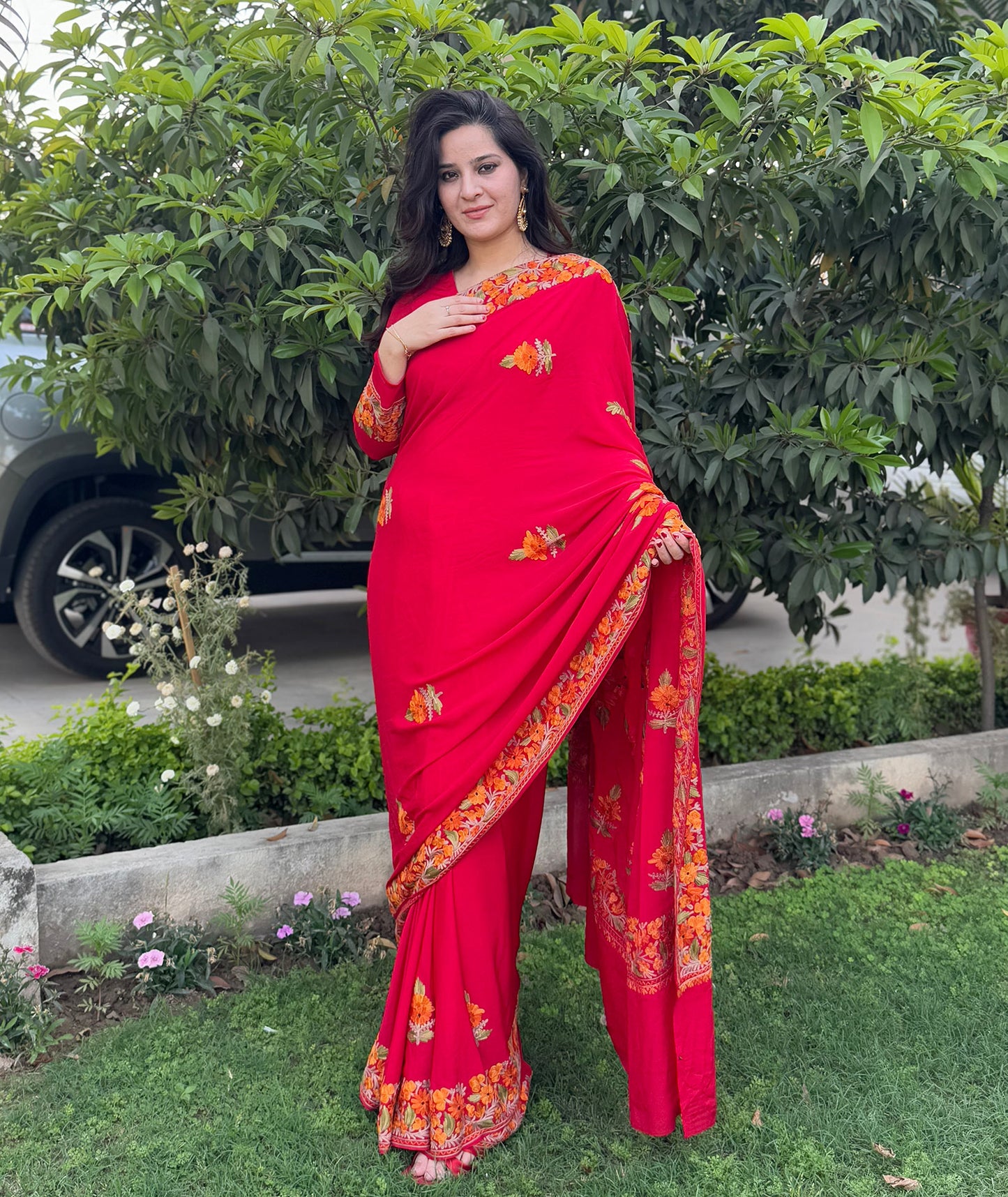 Red Top Seller Multifloral Aari Embroidered Kashmiri Pure Crepe Saree