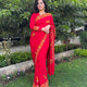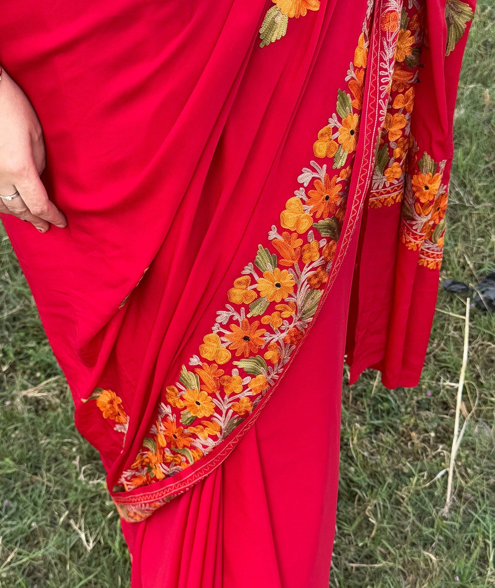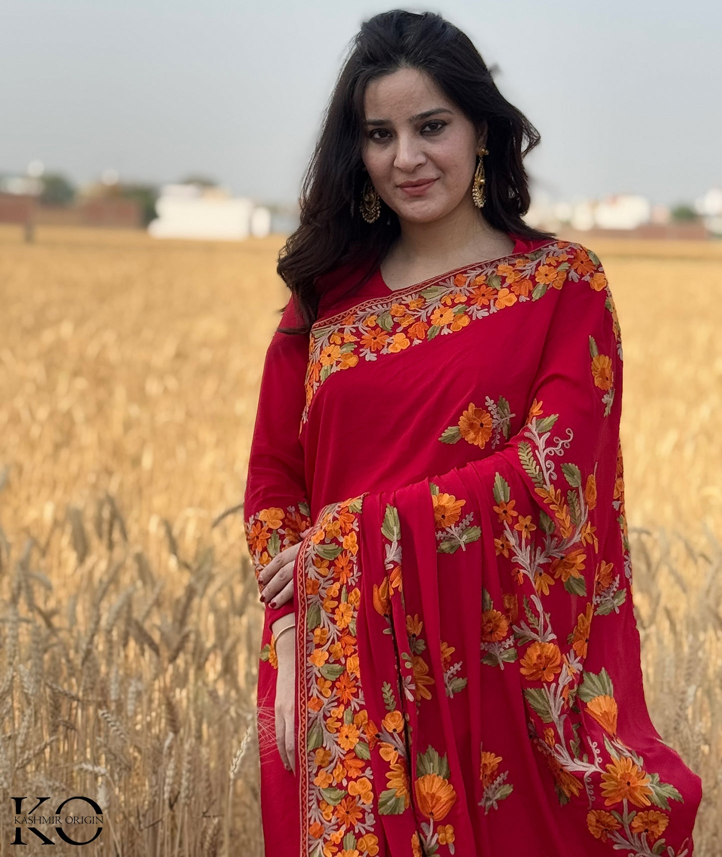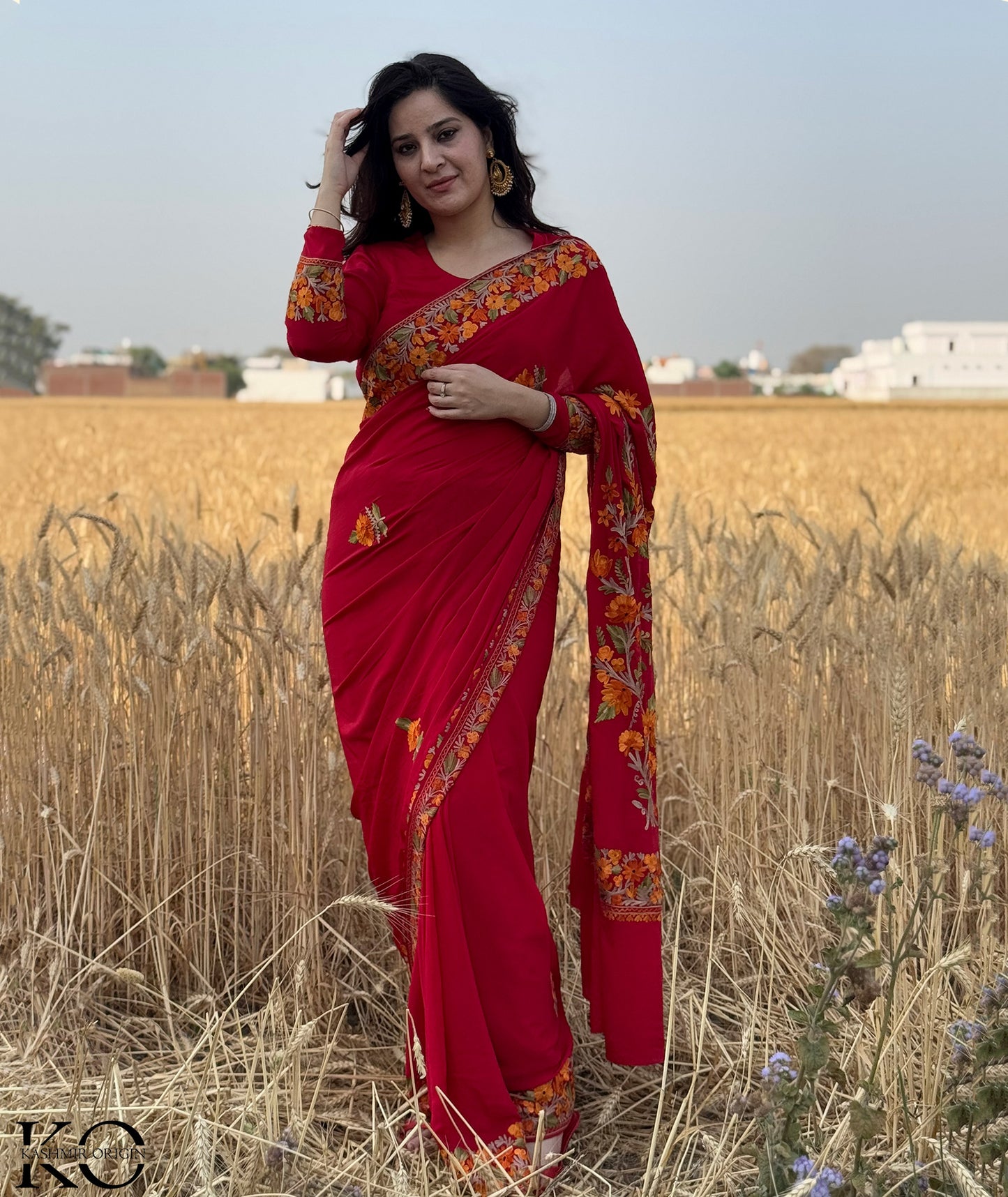 Red Top Seller Multifloral Aari Embroidered Kashmiri Pure Crepe Saree