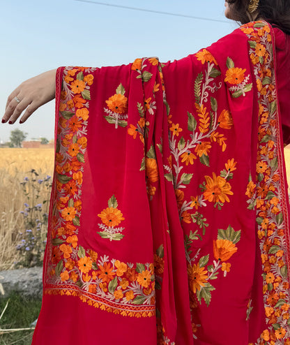 Red Multifloral Aari Embroidered Kashmiri Pure Crepe Saree