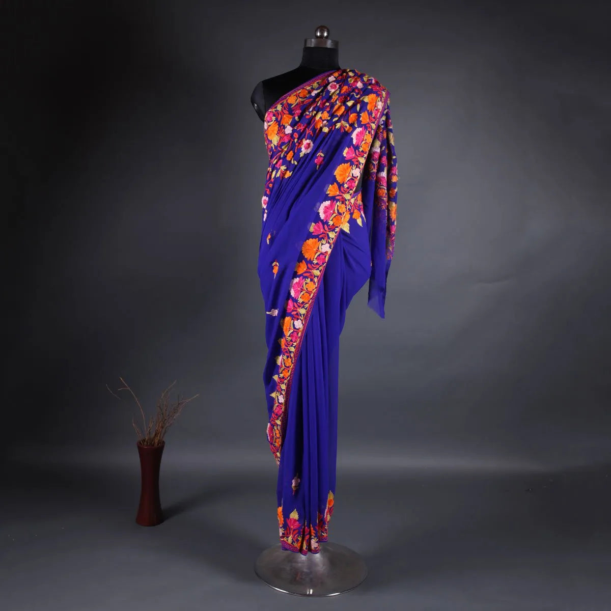 Royal Blue Floral Design Aari Embroidered Silk Saree