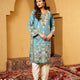 1. Complement the sky blue pheran with off-white or white trousers and a classic jutti.