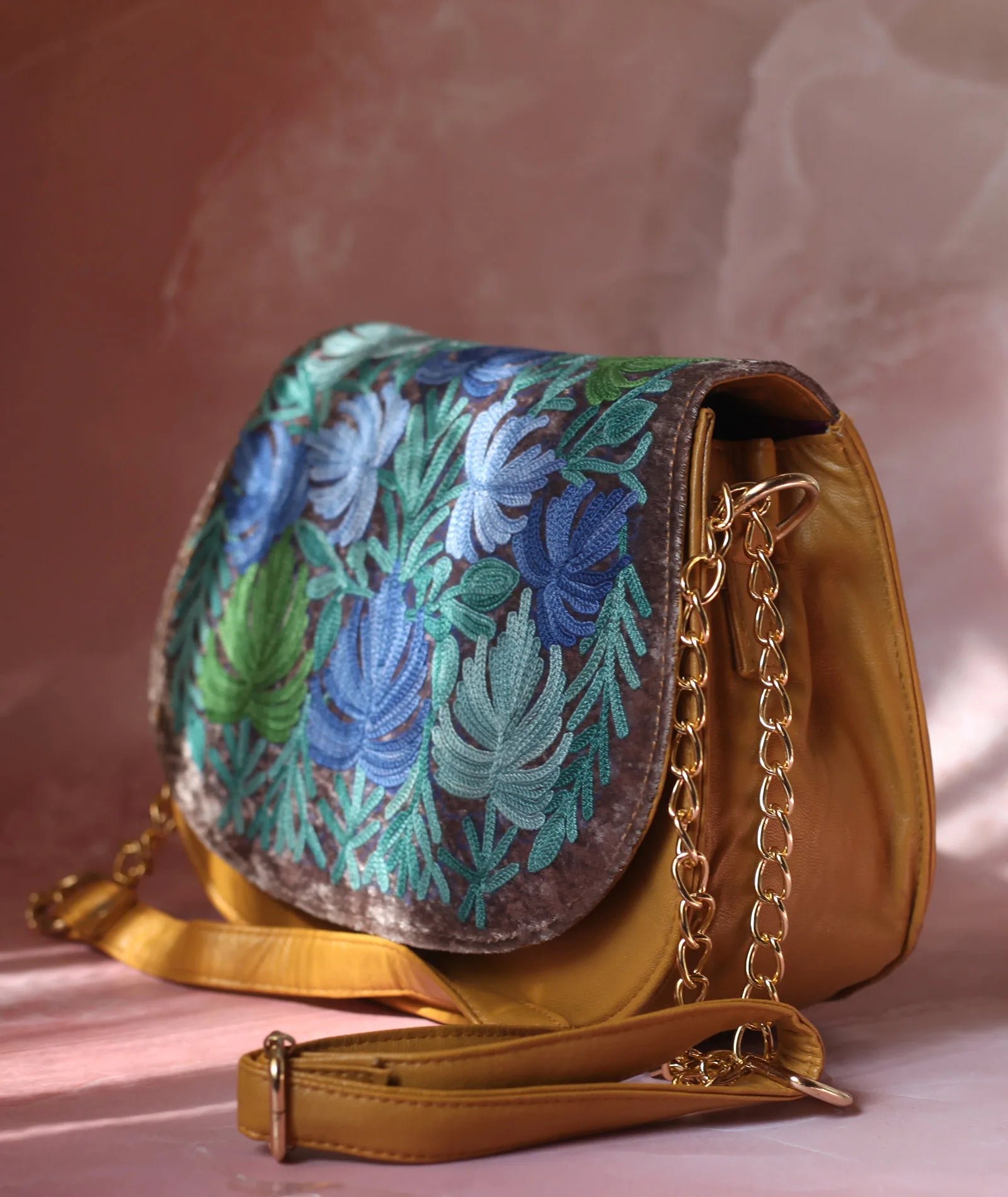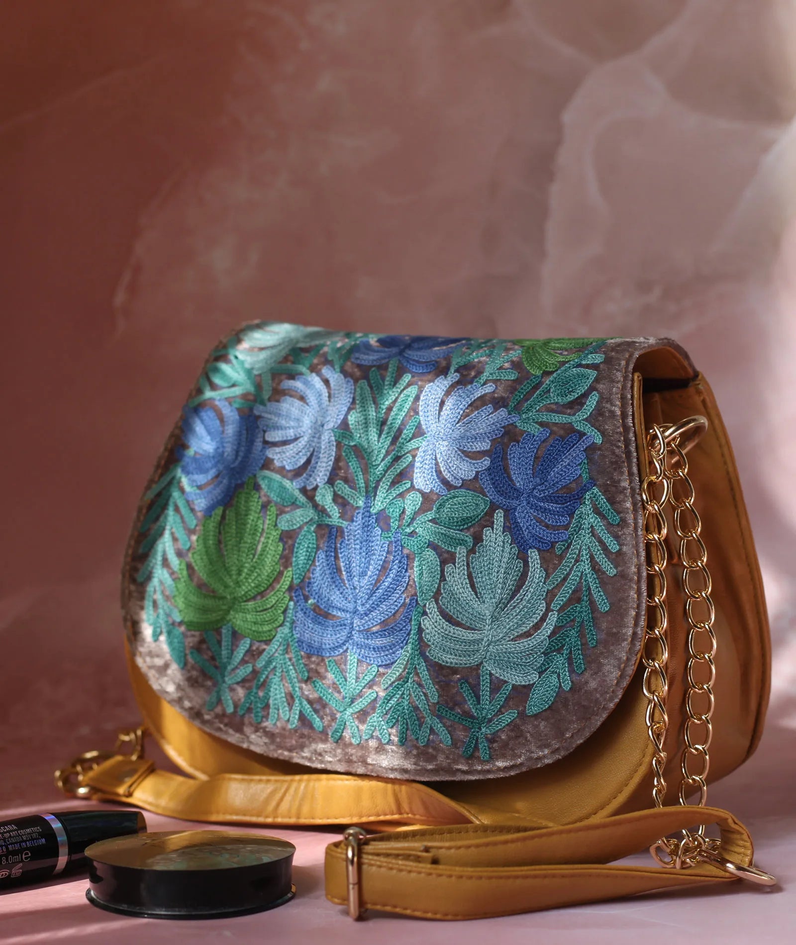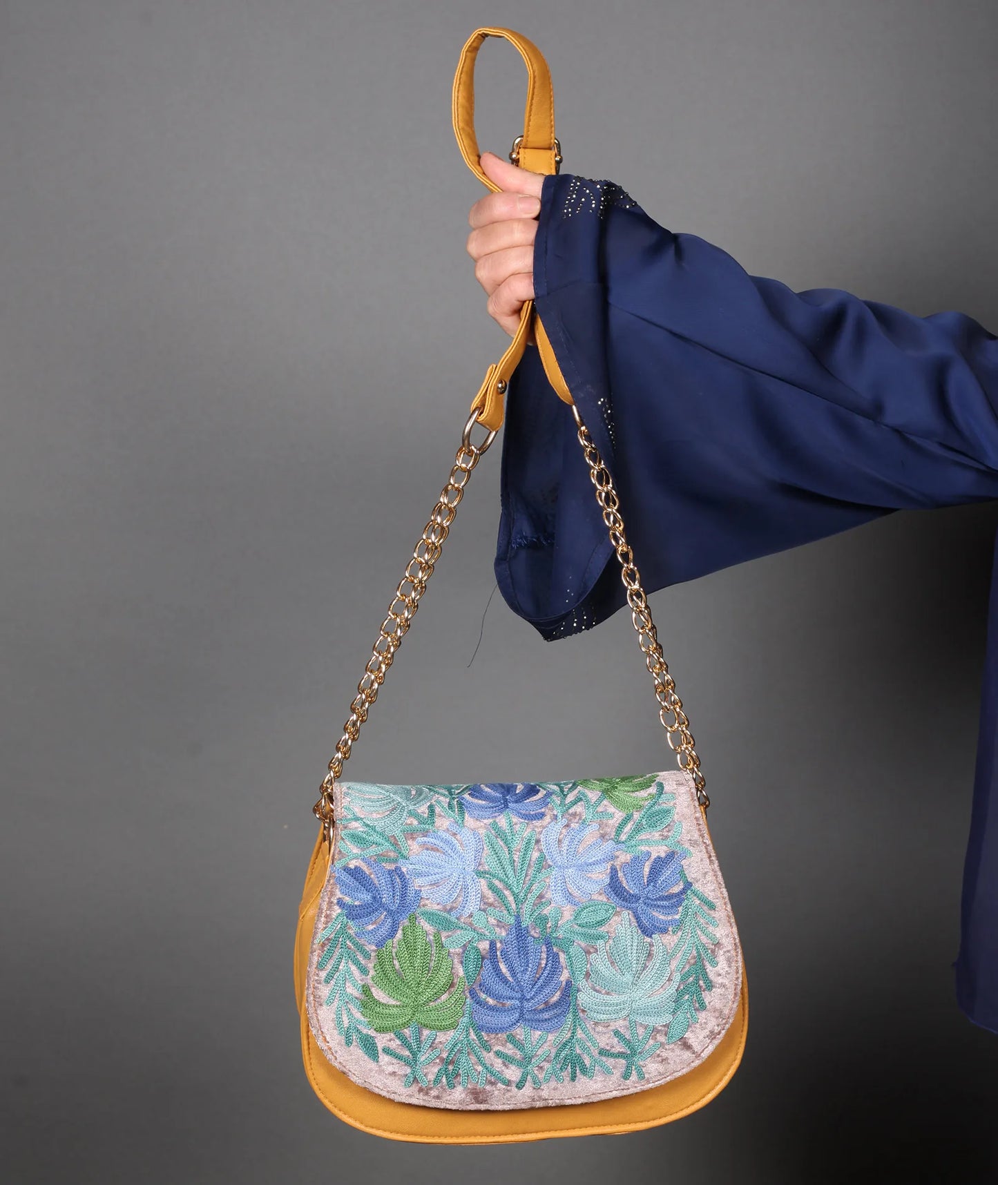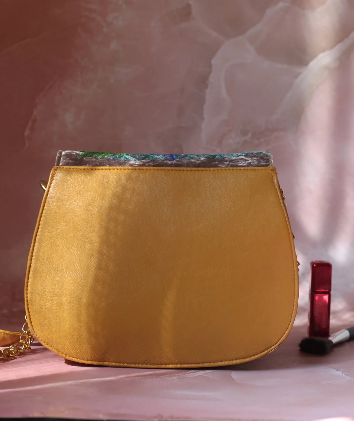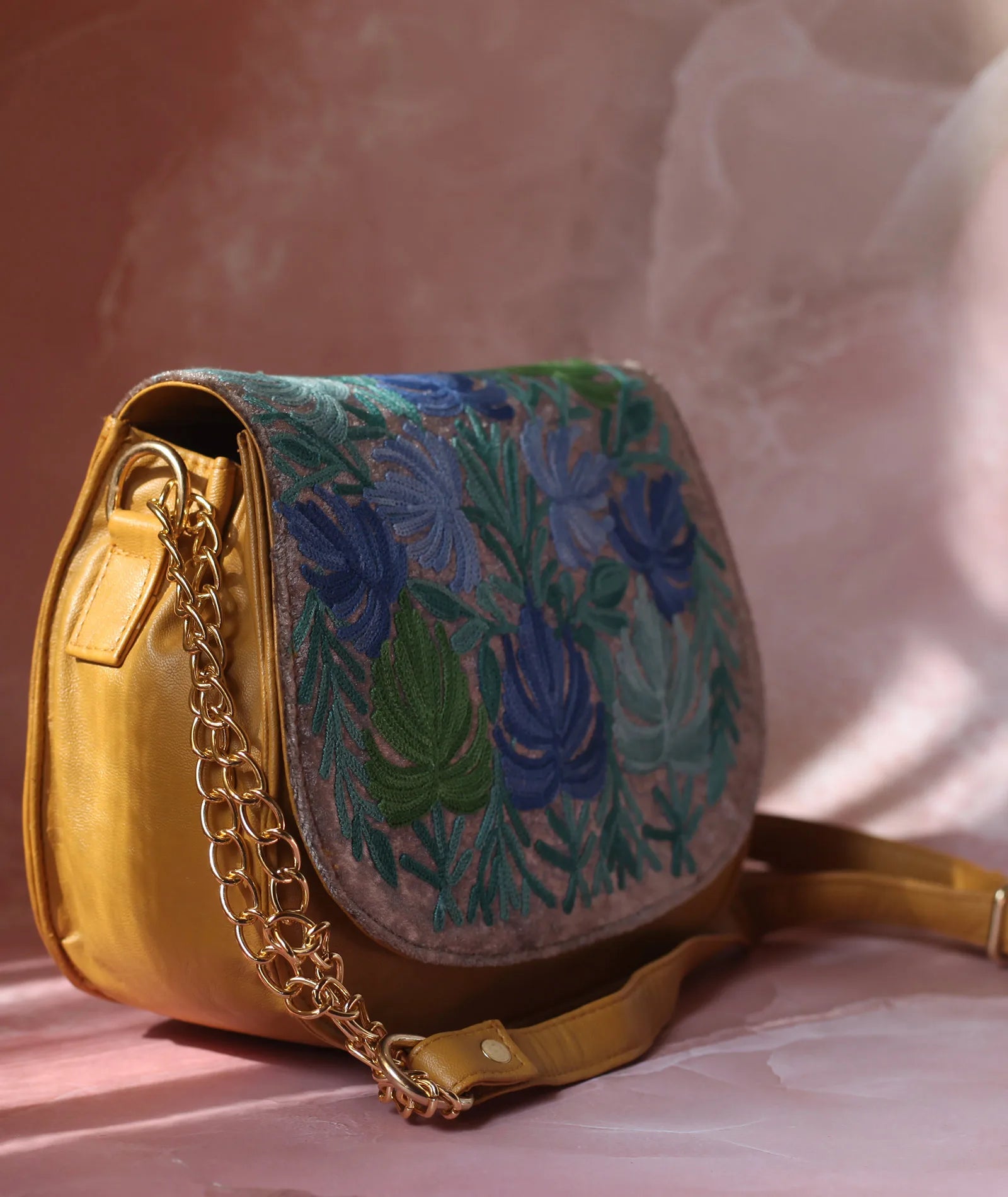 Yellow and Silver Chinar Aari Embroidered Full Flap Sling Bag