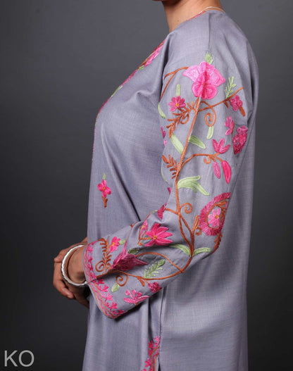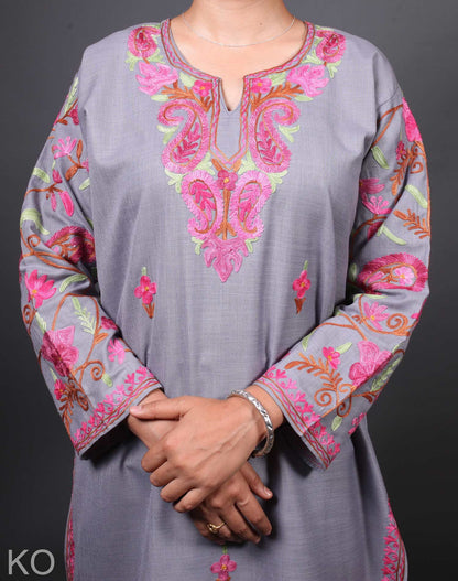 Subtle Stone Grey Aari Embroidered Arm Design Cotton Kurti