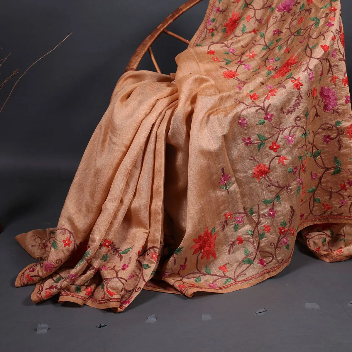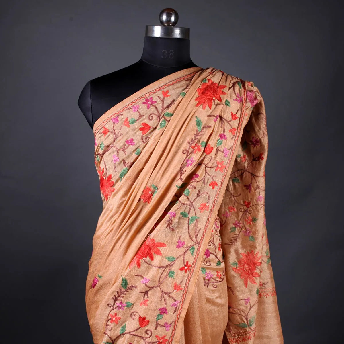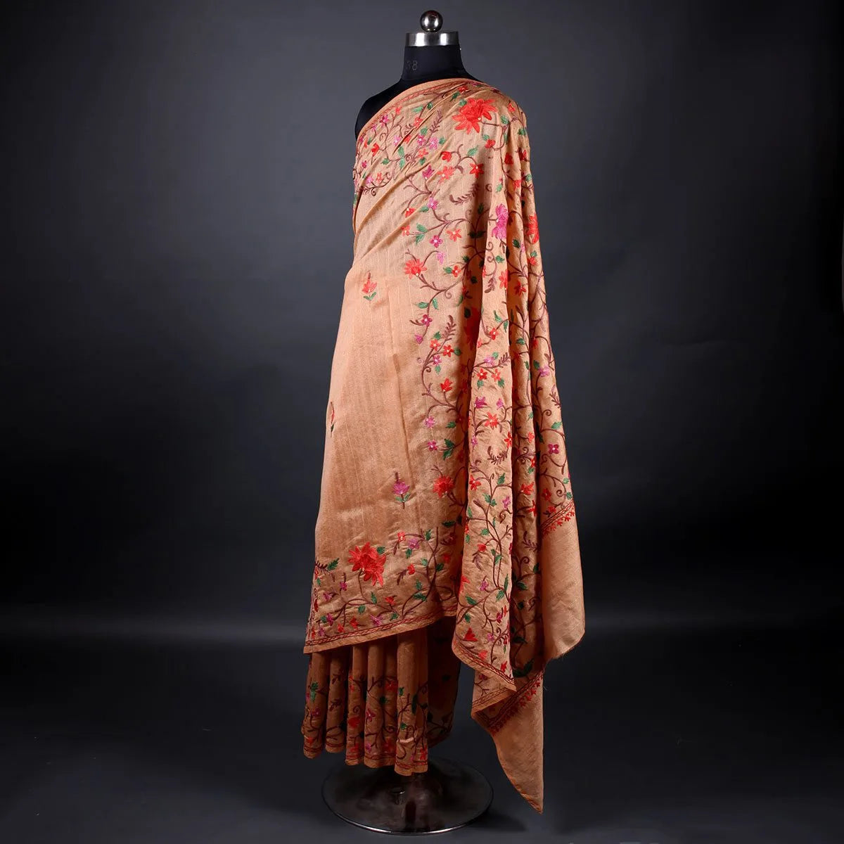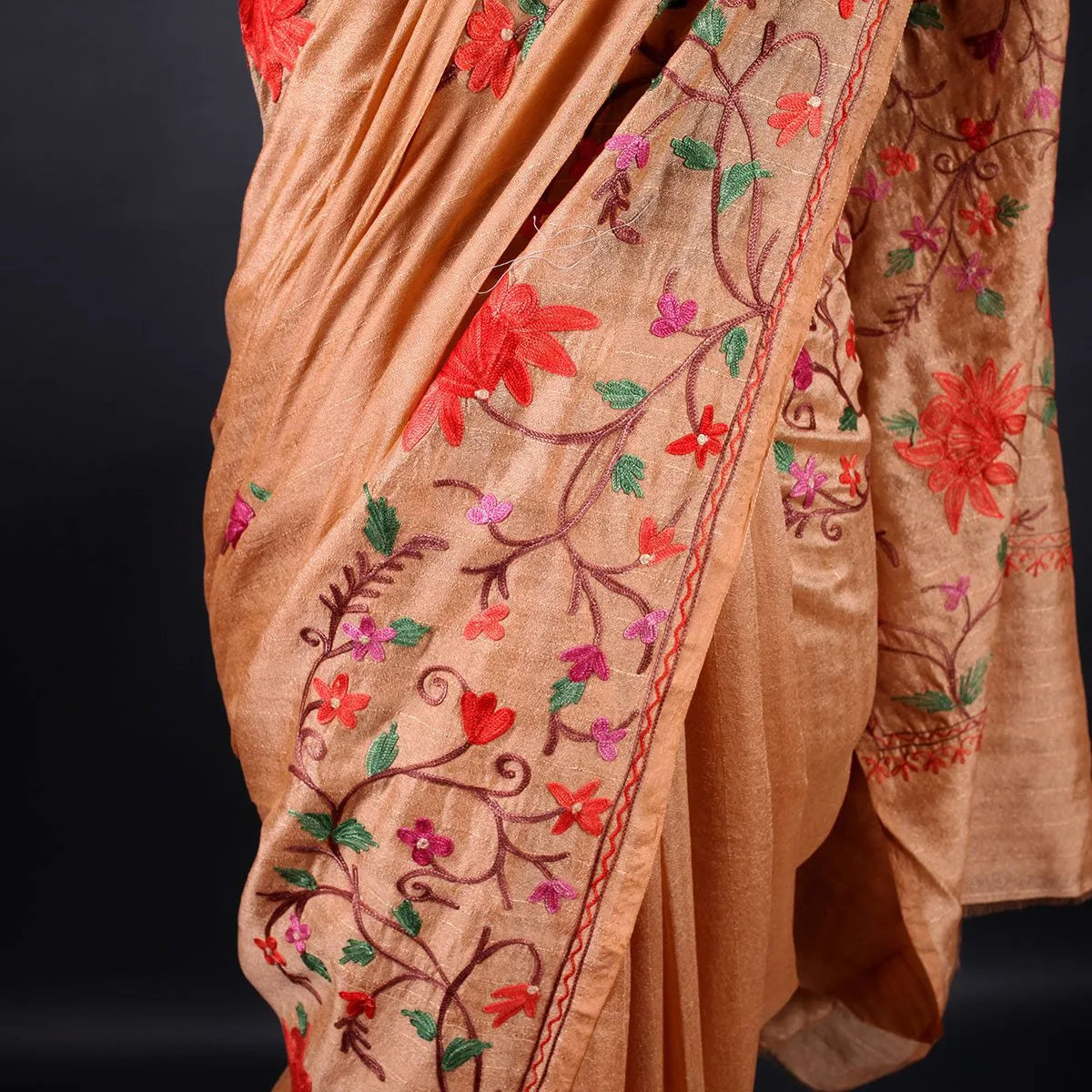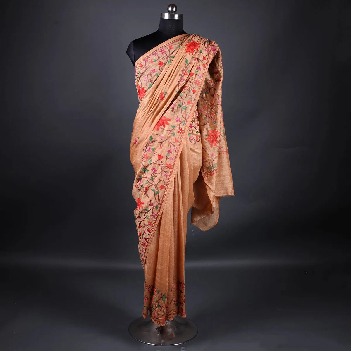 An exemplary Silk Saree has been immensely crafted ?skillfully to become an epitome of elegance for the women who would love to keep their dressing styles in culture and tradition. This Saree is a mixture of Tussar Silk with the shimmery Zari and Aari Embroidery of Kashmir. The dark Colour Silk base plays home to two simultaneous borders complimenting each other being the two age old crafts of thread work of the Valley. Drape this traditional symbol of epitome, style and art and let everyone get hanged when you walk around wearing this masterpiece.