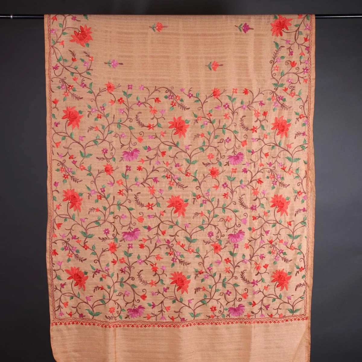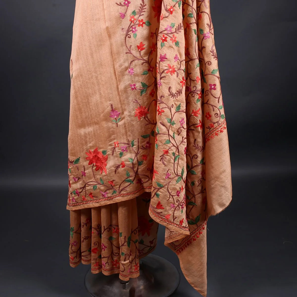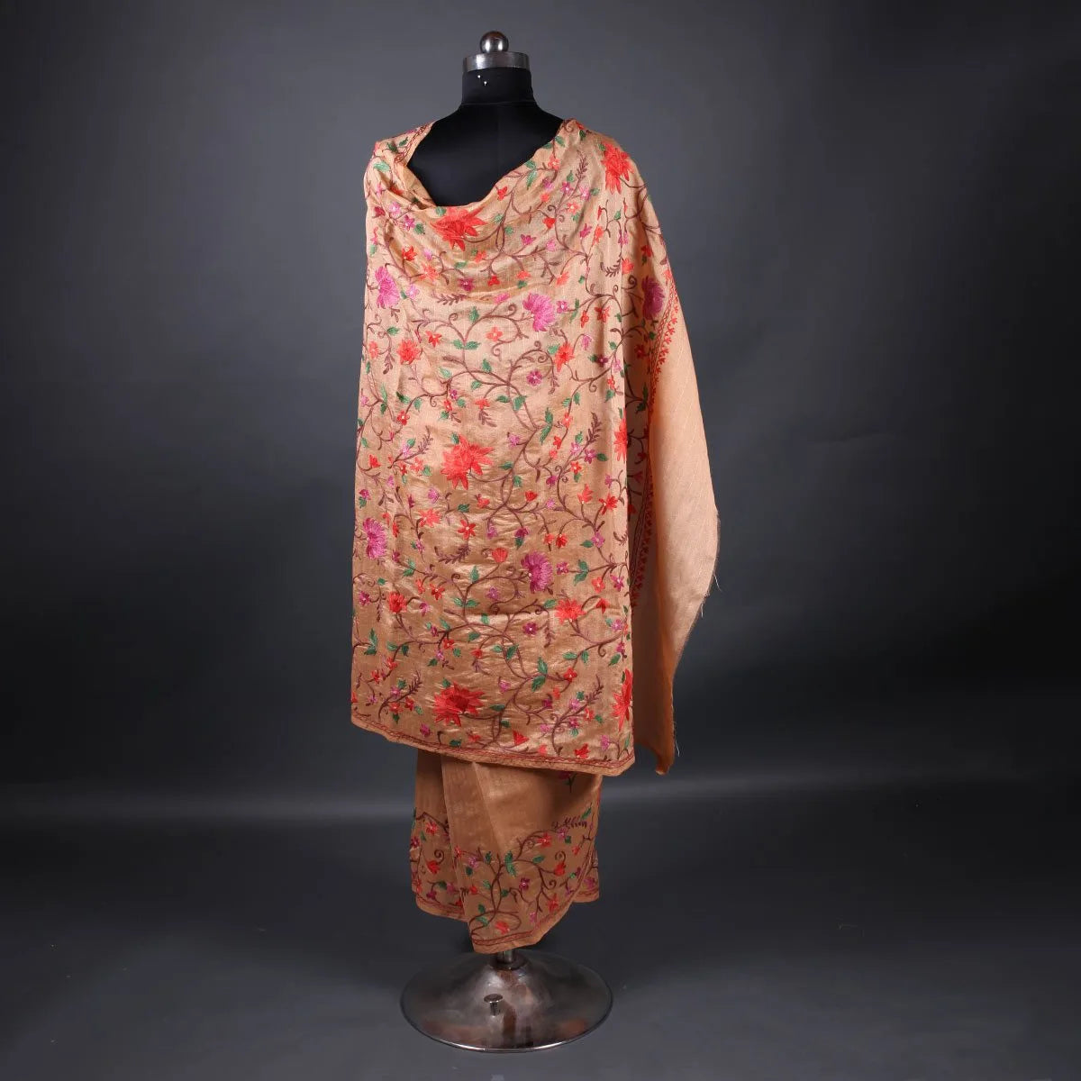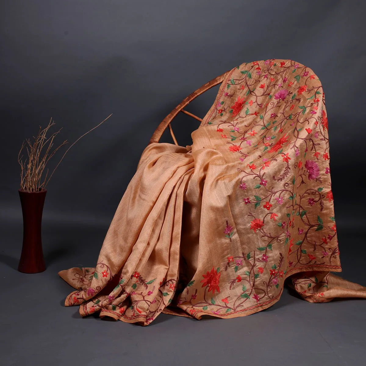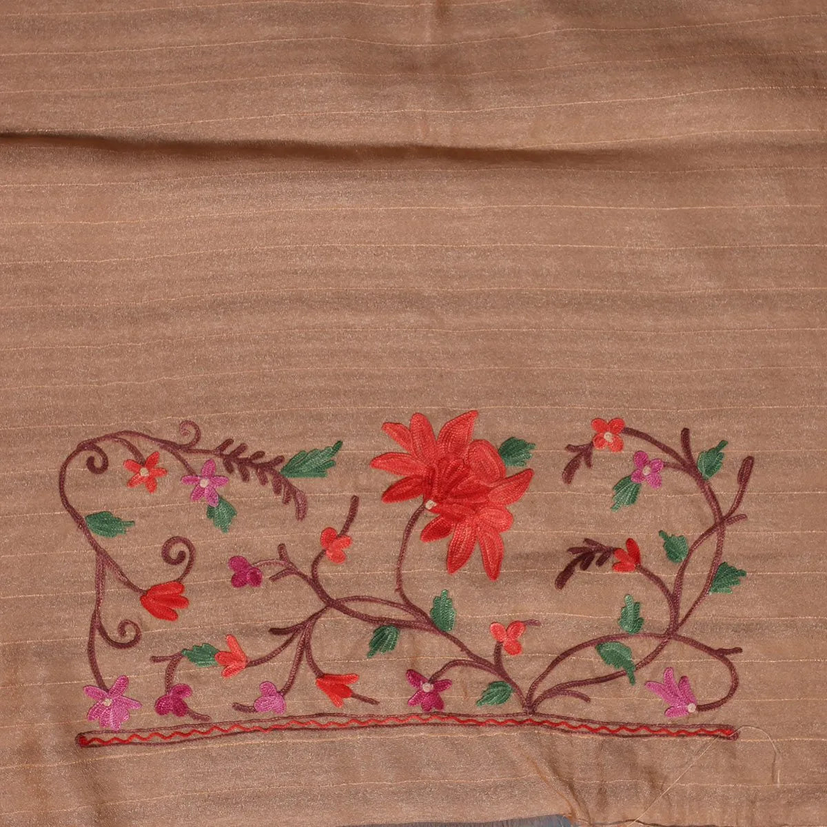 An exemplary Silk Saree has been immensely crafted ?skillfully to become an epitome of elegance for the women who would love to keep their dressing styles in culture and tradition. This Saree is a mixture of Tussar Silk with the shimmery Zari and Aari Embroidery of Kashmir. The dark Colour Silk base plays home to two simultaneous borders complimenting each other being the two age old crafts of thread work of the Valley. Drape this traditional symbol of epitome, style and art and let everyone get hanged when you walk around wearing this masterpiece.