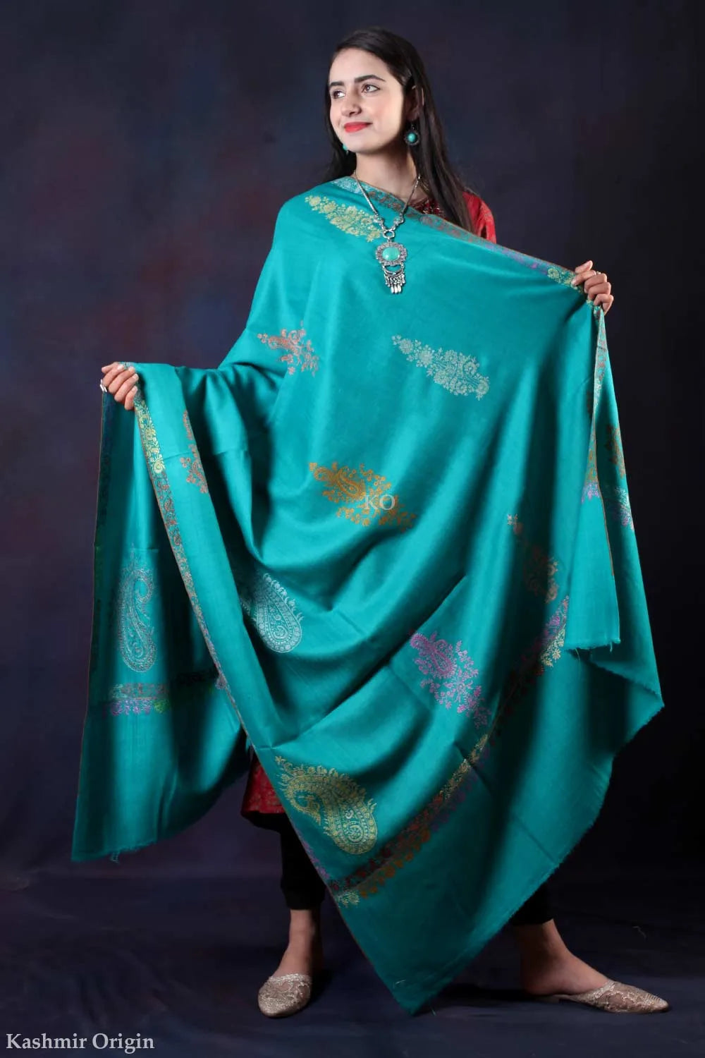 Tourquise Sozni Embroidered Handwoven Pashmina Shawl