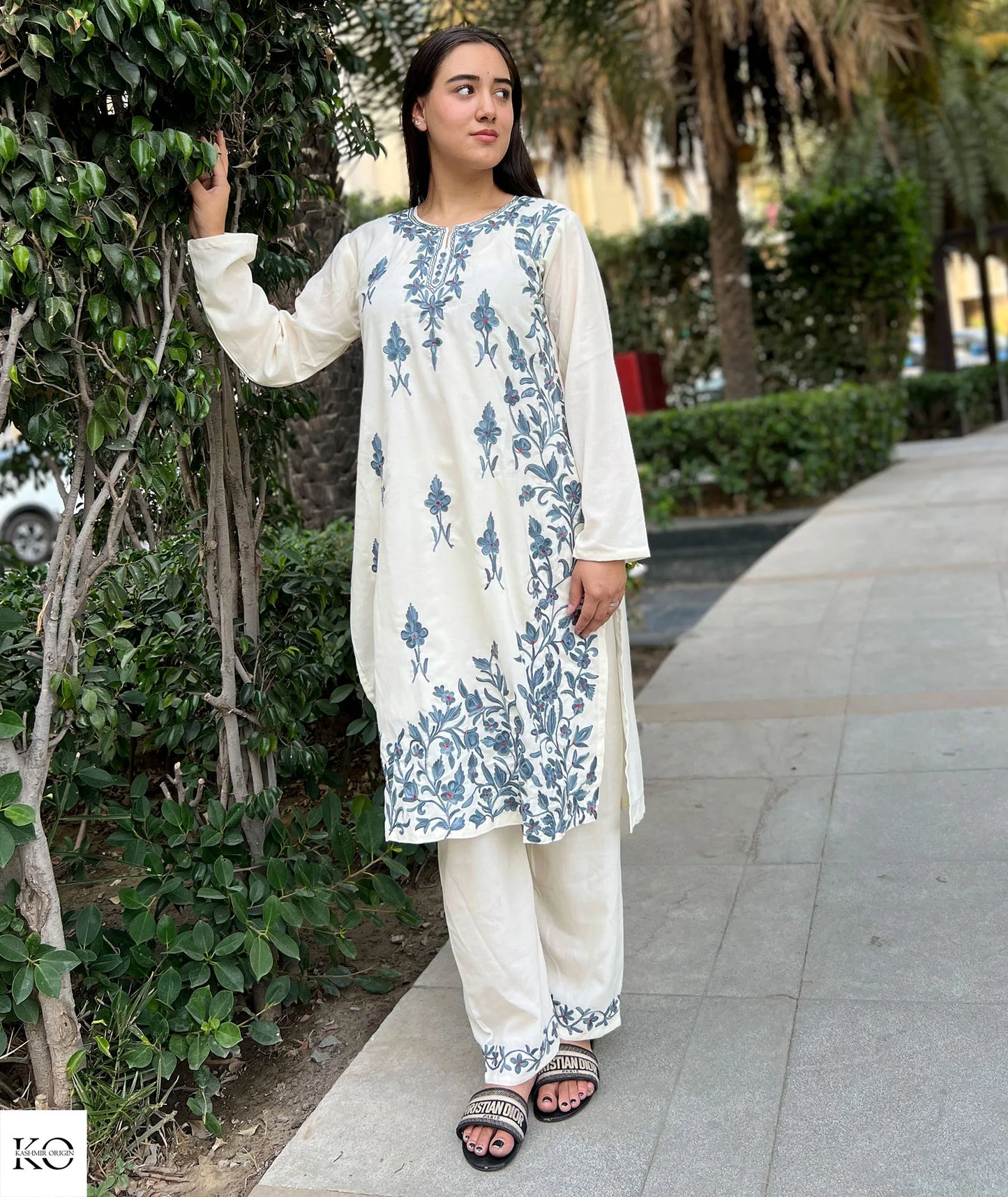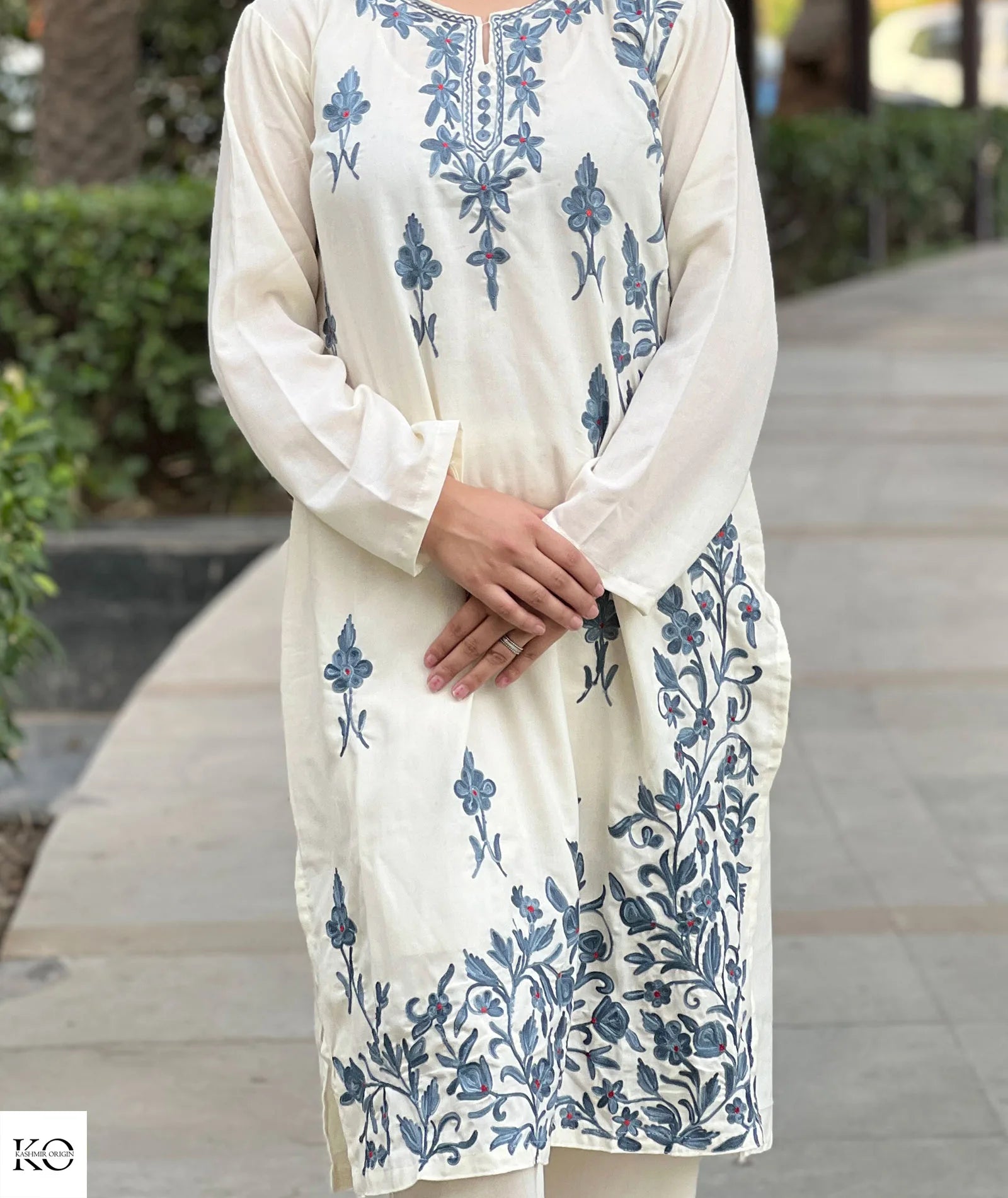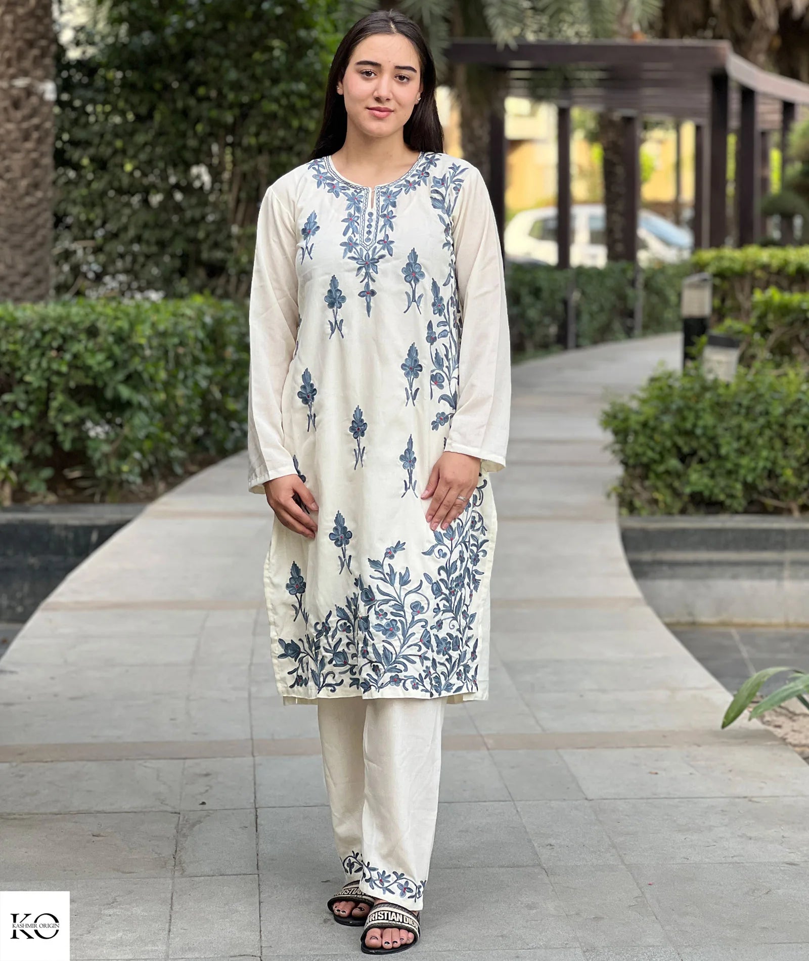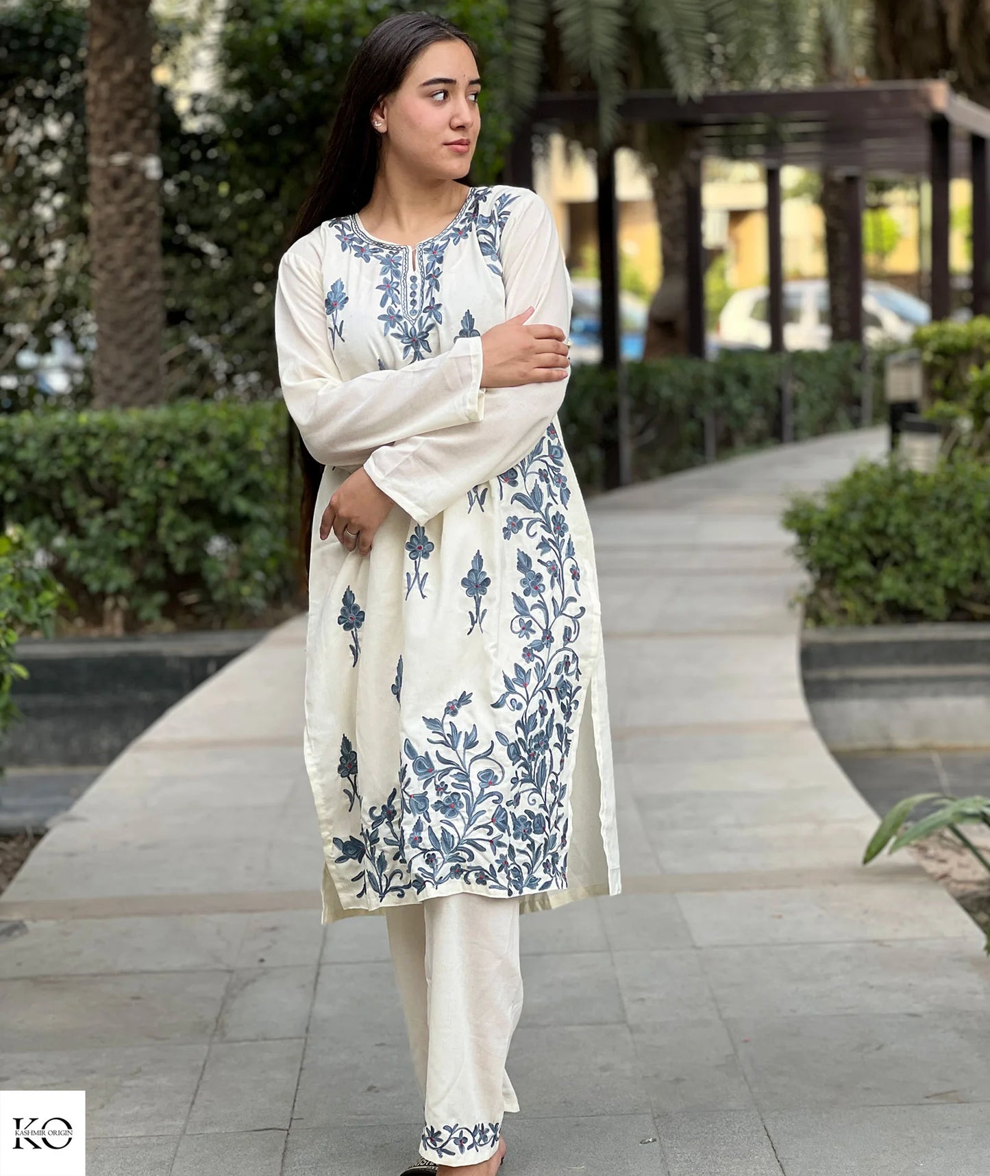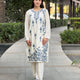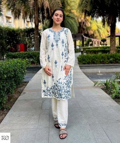 White With Grey Embroiderey Cotton Co ord Set | Full Suit
