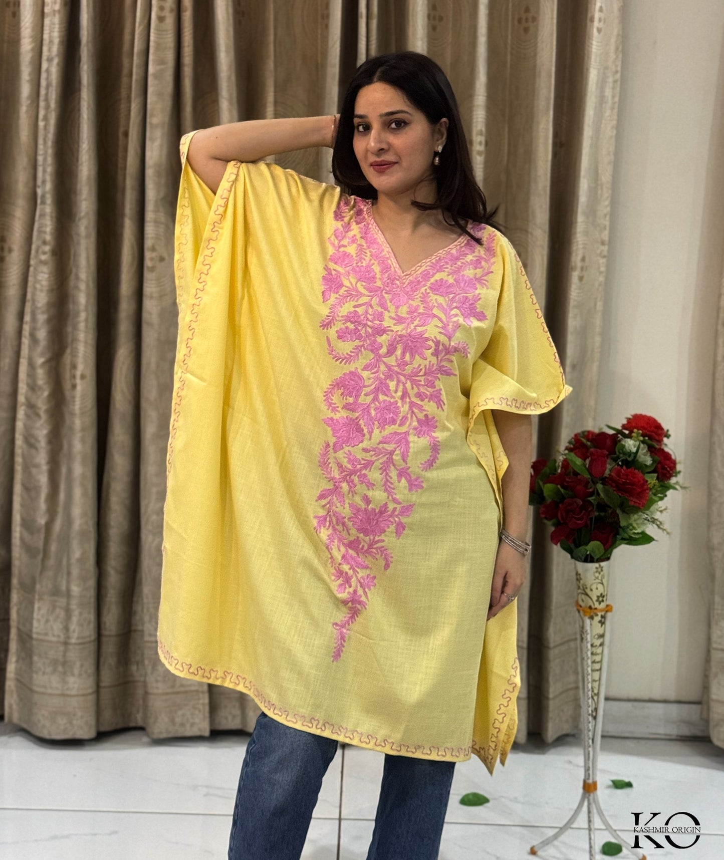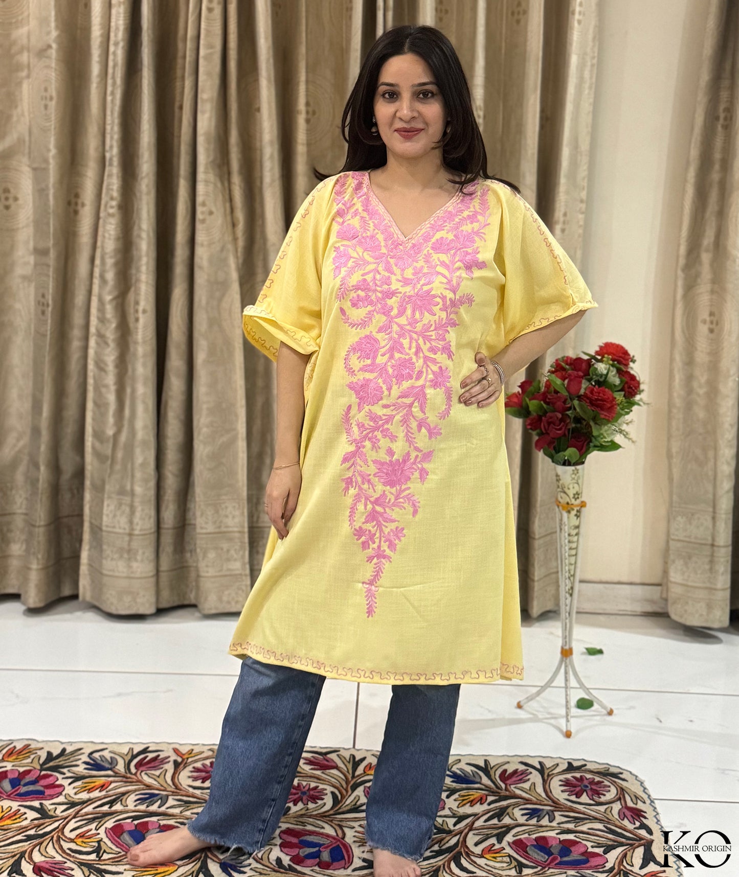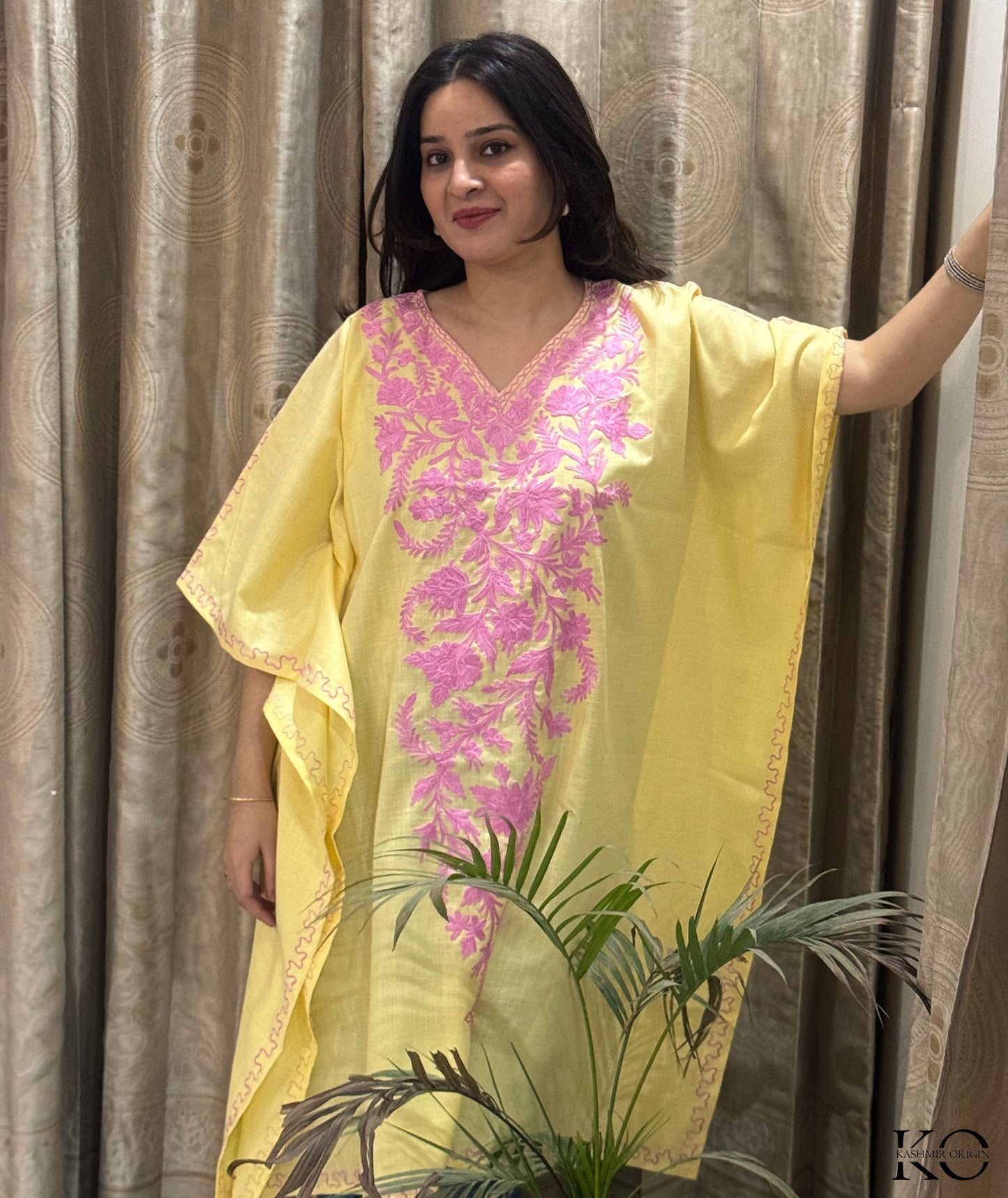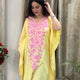 Add a touch of elegance and sophistication to your wardrobe with this Yellow With Pink Floral Aari Ebroidered Ruby Cotton Kaftan. Shop now at Kashmir Origin.